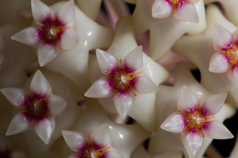Hoya carnosa war auch mein erster Verdacht. Ich hatte das aber erst mal ausgeschlossen, weil die Blütenblätter meiner Pflanze nach hinten abstehen, während alle H. carnosa-Bilder im Netz waagerecht ausgebreitete Blütenbläter zeigen. Das scheint sich aber gerade zu ändern, also warte ich erst mal ab, was sich da noch tut.