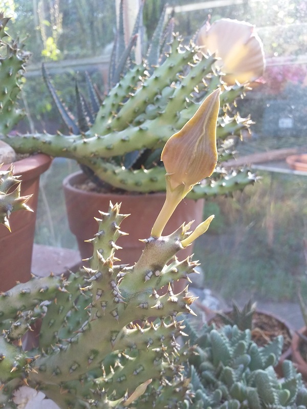 Meine Pflanze ist sehr kräftig, die Triebe sind hart und stark bedornt. Sie steht ab dem Frühjahr in meinem Gewächshaus. Dieses hat keine Heizung, und meine Sukkulenten und Kakteen müssen auch schon mal die eine oder andere kühle oder kalte Nacht aushalten. Dafür stehen sie den ganzen Sommer in voller Sonne, und haben viel Luft.