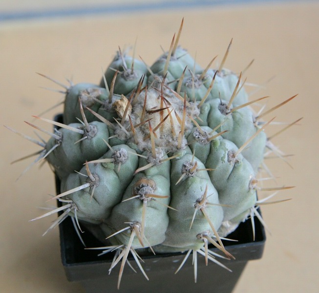 Auf der Seite von Spiniflores habe ich dann aber doch eine Nahaufnahme gefunden, die eine Pflanze zeigt, die meinen doch sehr ähnlich ist. Ich denke es handelt sich somit doch recht eindeutig um Copiapoa cinerascens.