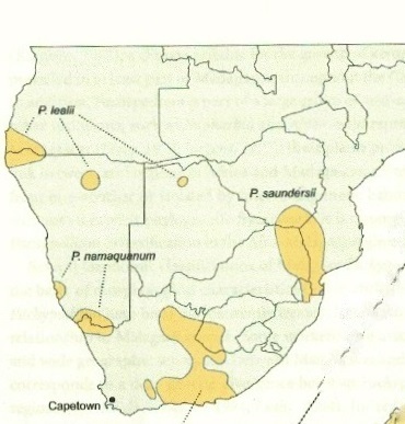 Pachypodium succulentum ist eine der fünf Pachypodienspezies die im südlichen Afrika beheimatet sind, Karte.
