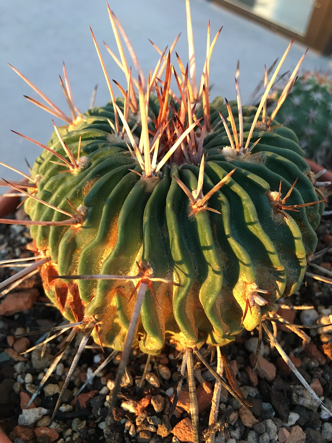 Der Kaktus hat wellenförmige Rippen und heftige Stacheln.