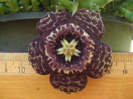 Ich meinte mit "überhaupt nicht stimmen" eigentlich den Namen Stapelia. Und was heißt Mini-Variegata. Die Blüte hat aufgeklappt immerhin einen Durchmesser von 50 mm. Wie groß ist denn Deine Normal-Variegata? Oder meinst Du mit Mini den Pflanzenkörper?