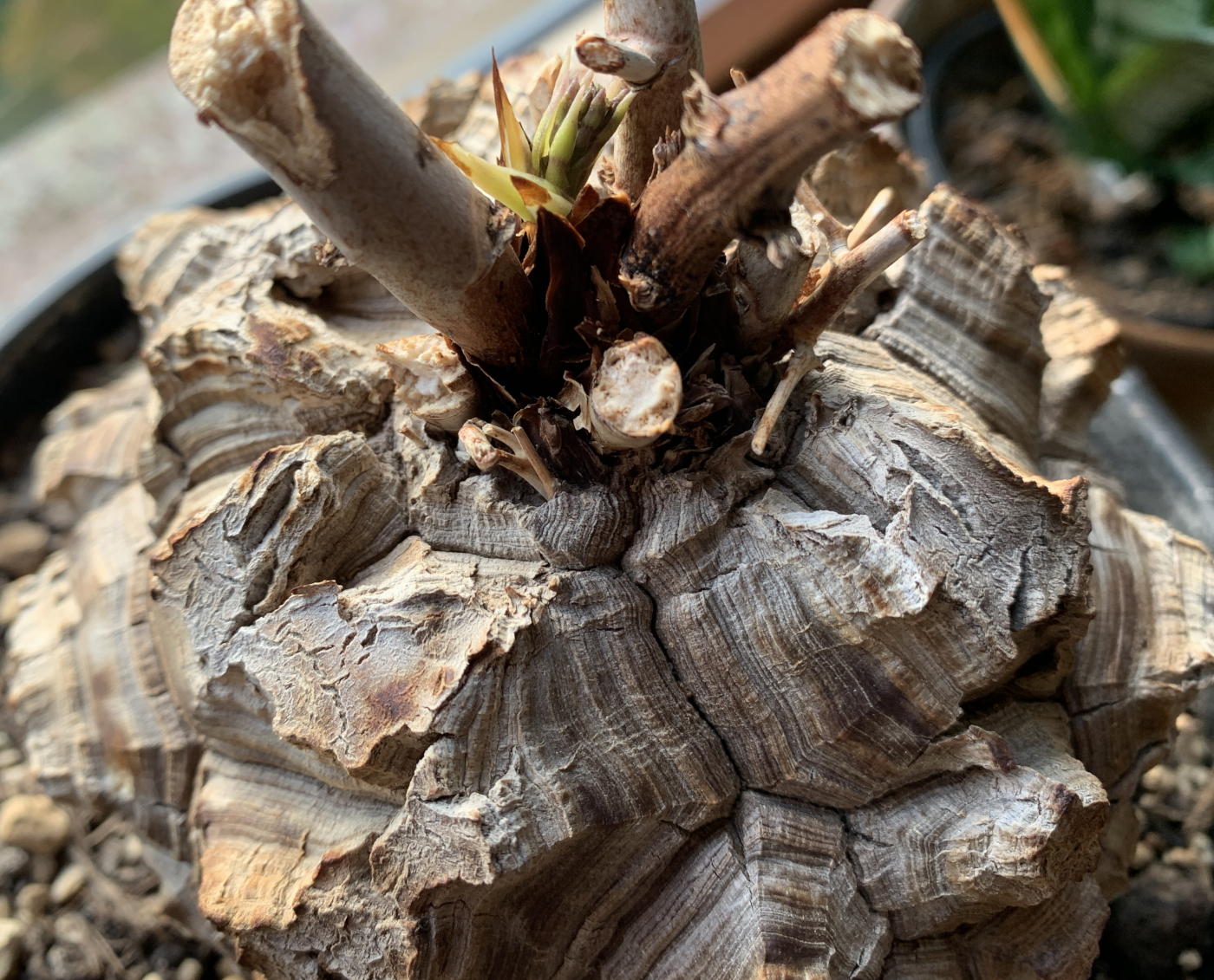 nach über 3 Jahren mal das Thema wiederbeleben. Der Caudex (?) meiner ältesten Pflanze in der Sommerruhe. Ist doch ein schöner Anblick, oder?