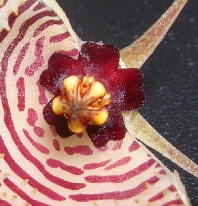 Staminale Nebenkrone mit nach innen gebogenen, mäßig stumpfen, gelben, zur Spitze hin graubraun angelaufenen Cs-Zipfeln, welche das Gymnostegium nur wenig überragen und sich in der Mitte berühren, Kuppe des Gymnostegiums in 5 helle Höcker geteilt, von den Cs-Zipfeln größtenteils verdeckt, Gleitschienen gelb, nur in der oberen Hälfte des Gymnostegiums angelegt.