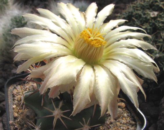 war mittels 2 Stapelhülsen eine weitere Kiste. Das war natürlich nicht ganz so sonnig und hell. Sonst benutze ich auch ein sehr mineralisches Substrat, bestehend aus Bims, Granitgrus, Quarzsand, gelbem Löslehm und ganz geringen Humusanteilen aus Rindenhumus, sowie auch noch feiner Pinienrinde (Dekorrinde bis 7 mm für Friedhofgräber). Den Lehm findet man hier im Bonner Raum im Erftkreis als Untergrundlehm. Er läßt sich im trockenen Zustand leicht zerbröseln im Gegensatz zum Oberflächenlehm, der nach Trocknung hart wie Beton ist. Hieraus stelle ich mir eine Grundmischung her, die ich bei Gebrauch noch mal mit der gleichen Menge Bims mische. Jetzt steht die Pflanze auf dem Tisch, werde sie aber in Zukunft auf der Hänge plazieren. In der beschriebenen Mischung wachsen alle meine Pflanzen recht gut, besonder auch die Ariocarpen, meine besonderen Favoriten und die Echinocereen.