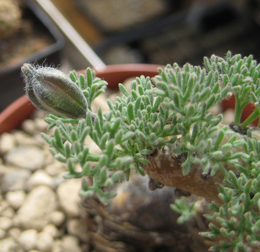 Ich greife das hier nochmal auf. Ich war ja dieses Jahr im Mai auf meiner Kakteenrundreise auch bei Specks. Dort sagte mir Frau Specks, die Sarcocaulons können alle raus ins Freie ab Juni. Habe ich also prompt auch gemacht mit meinen beiden (S. crassicaule, S. multifidum). Sie haben sich auch gut gemacht und vor etwa 3 Wochen wieder das Laub getrieben. Jetzt hab ich sie reingeholt, weil mir das doch zuviel Regen ist. Und siehe da, eine Knospe:Asclepidarium hat geschrieben: Bemerkenswert bei S. crassicaule ist auch, dass sie sich ziemlich gut, zumindestens ab Juni/August im Freien halten lässt und kein ausgesprochener Winterwachser wie viele anderen Sarcocaulon ist.