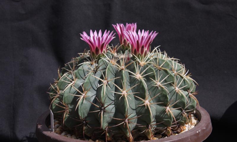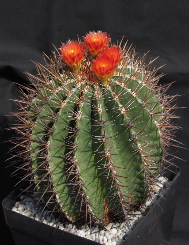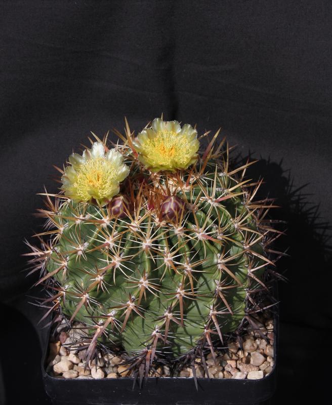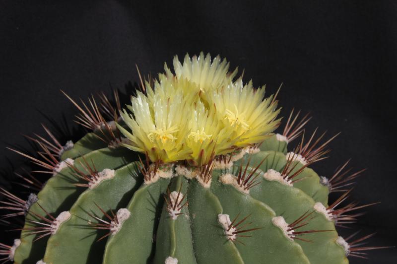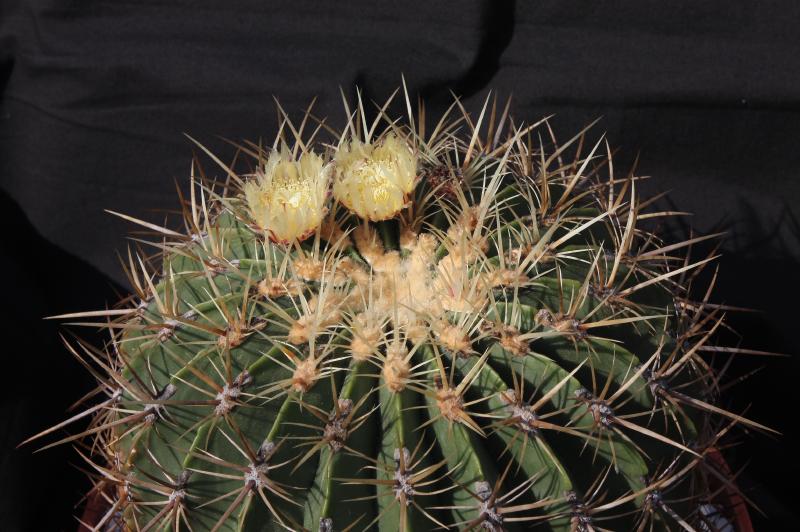 Der zweite Fero ist ein F. acanthodes var. tortulispinus, der gerade (nach 19 Jahren in Kultur und einem Durchmesser von 14 cm) zum ersten Mal blüht.