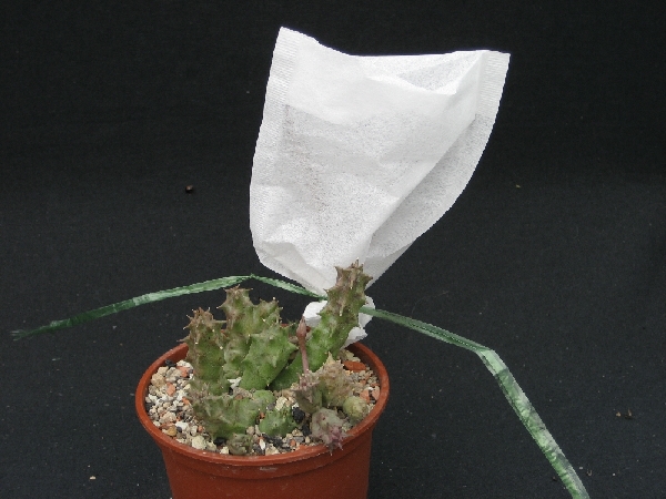 Das Foto zeigt eine Duvalia corderoyi. Die Samenhörnchen sind in einem Teebeutel verpackt