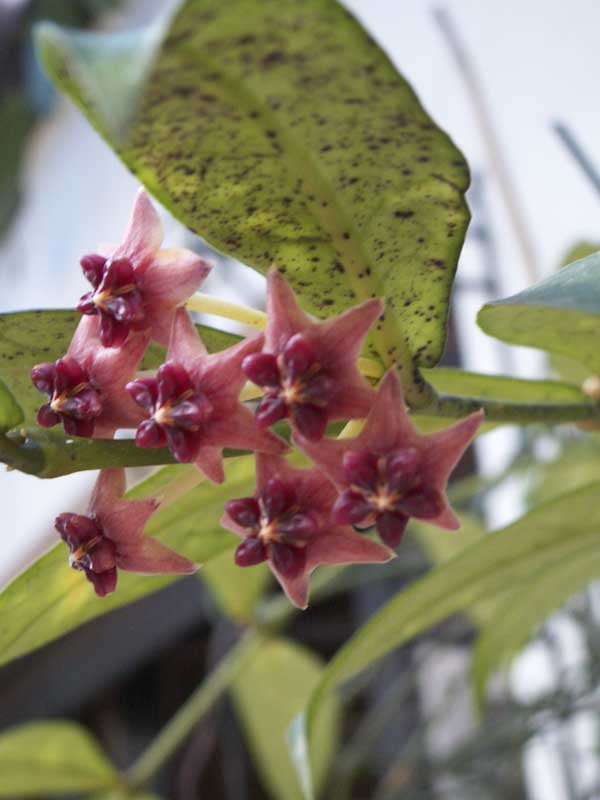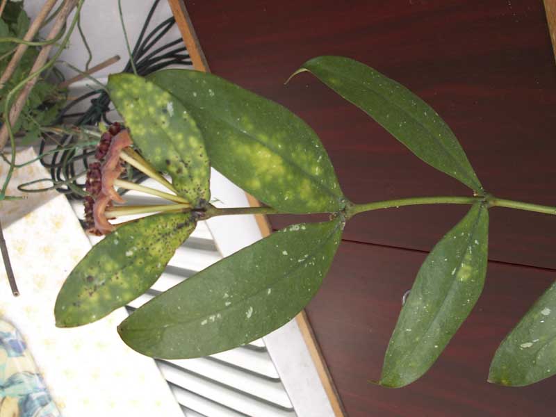Meine Hoya lobbii ist auch eine junge Pflanze und blüht erstmalig bei mir. Die Blüte scheint etwas heller zu sein, als bei Hildor. Die gelben Flecken auf den Blättern sind auch vorhanden und scheinen charakteristisch für die H. lobbii zu sein. Schwarze Flecken hab ich keine entdeckt.
