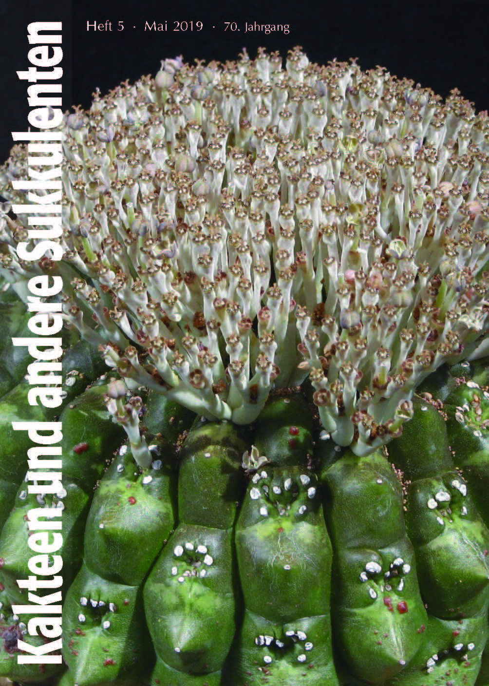 Das erwartet uns in der Ausgabe Mai 2019 unserer Zeitschrift „Kakteen und andere Sukkulenten“: Titelbild: Euphorbia gymnocalycioides (Foto: Manfred Figge)
