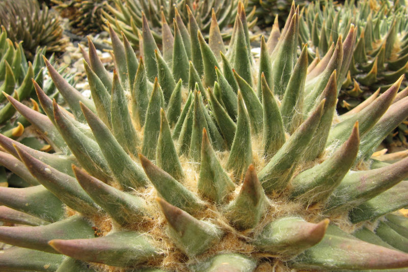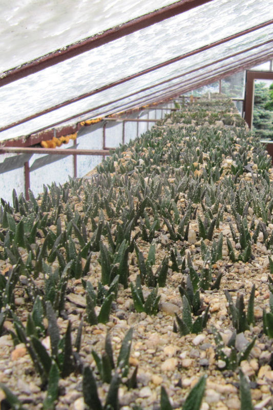 Er führte uns zuerst in seine Sämlingsanzucht. Ich wollte mir mit Brille die Sämlinge etwas genauer betrachten, die Luftfeuchte war so hoch, dass es keine Durchsicht gab. Die nächsten Häuser waren gefüllt mit der Aufzucht. Man sah es den Pflanzen an, dass sie sich sehr wohl in diesem Klima fühlten. Im Anschluss kam für uns der Höhepunkt: die Sammlung die Ariocarpen von Karel Rys. Seine ältesten selbst ausgesäten Sammlungspflanzen sind ca. 40 Jahre alt. Im Anschluss führte er uns noch durch zwei kleine Verkaufshäuser.