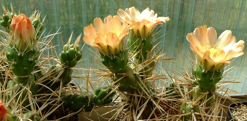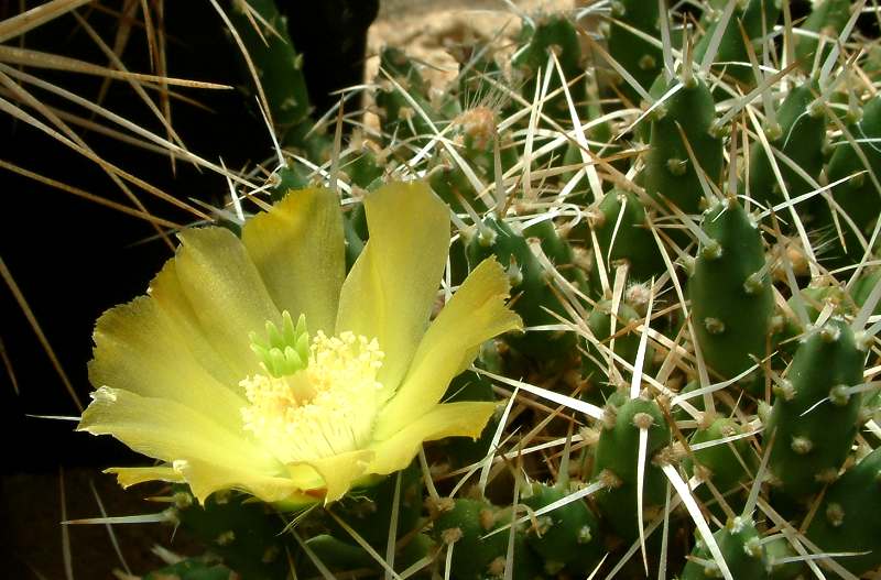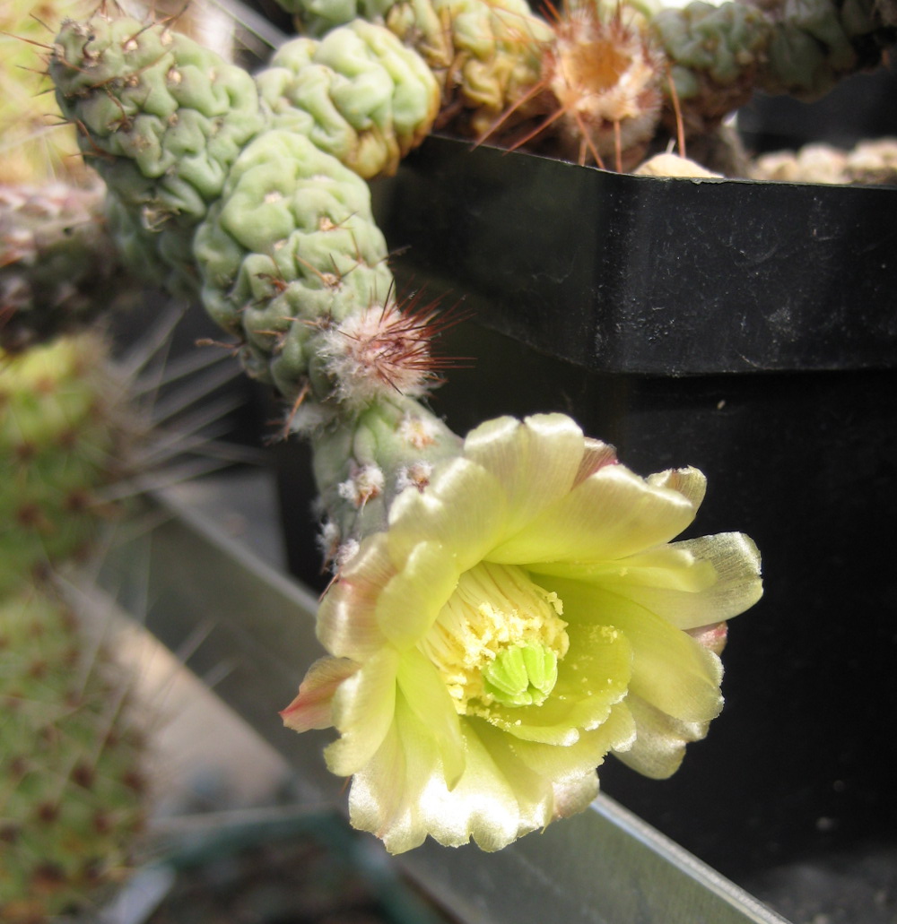 Wenn man das Bild genau betrachtet, sieht man auf den Pflanzenabschnitt 3 eingezogene Blüten; das ist bei mir bei vielen Pflanzen die Regel. Die Aufstellung dieser Pflanze ( Maihueniopsis glomerata Typ B, Uhlig- Kakteen) an einem neuen Standort zusammen mit 2 anderen (Maihueniopsis platyacantha) zum Testen, brachte wenigstens für dieses Jahr den Durchbruch. Während die anderen Pflanzen am alten Standort bekanntermaßen wieder die Blüten komplett einzogen, brachten wenigstens die drei Pflanzen am neuen Standort ein paar Blüten durch; immerhin ein Blüherfolg von 100 %!