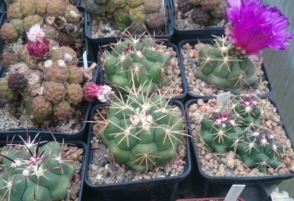 es ist langsam wieder Thelocactus heterochromus-Blütezeit. Einige Sämlingspflanzen kommen zur Erstblüte und haben Knospen. Diese sehen immer so malerisch aus, wenn sie langsam über die langen, bunten Dornen hinaus wachsen. Kultiviert wird Th. heterochromus in einem groben, lehmhaltigen, mineralischen Substrat mit ganz wenig Humusanteil. Am heimatlichen Standort in Durango, Mexico, wächst er in steinig, felsigen Regionen, oft zusammen mit Echinomastus und Echinocereus pectinatus. Er wächst langsam und wenn man ihm viel Licht und Sonne gönnt bekommt er auch die dicken und bunten Dornen. Bei mir wachsen sie auf meinem Hochbeet ca. 60 - 70 cm unter den Dachplatten in voller Sonne.