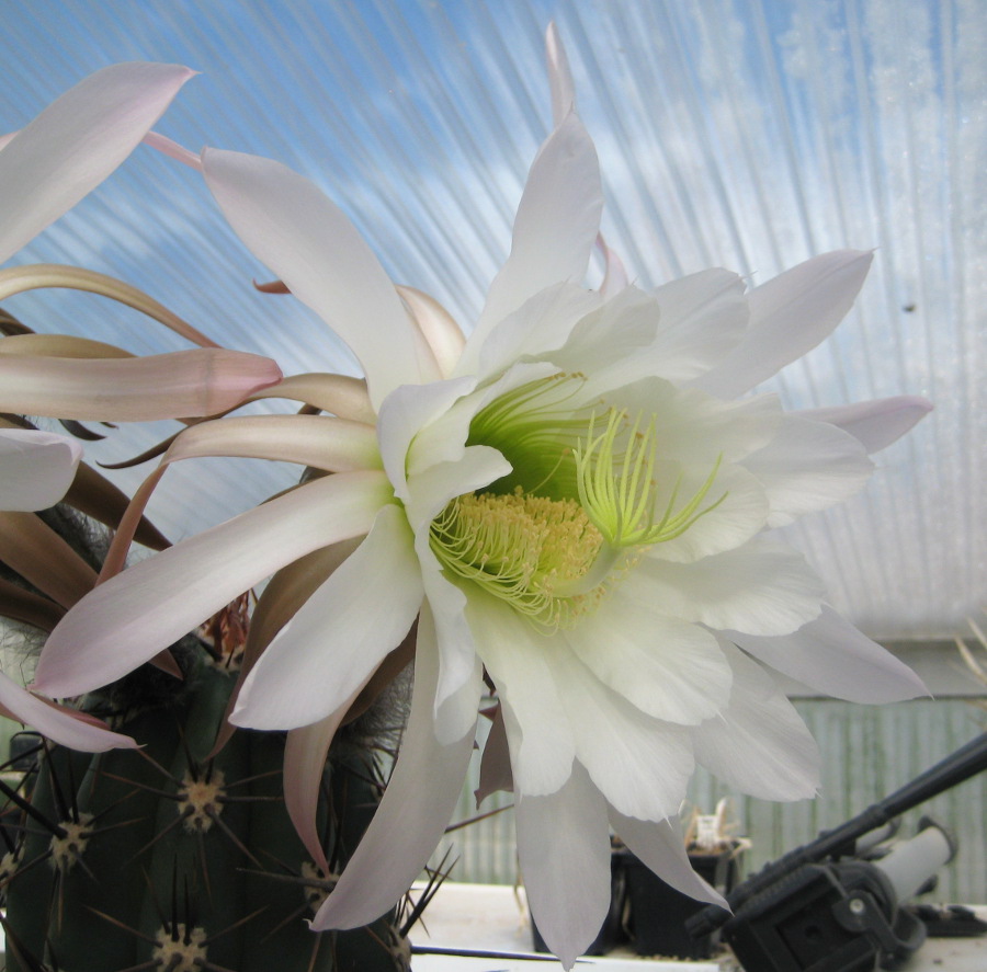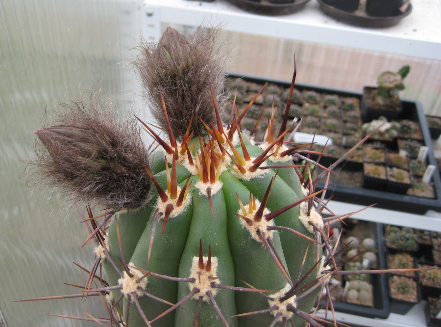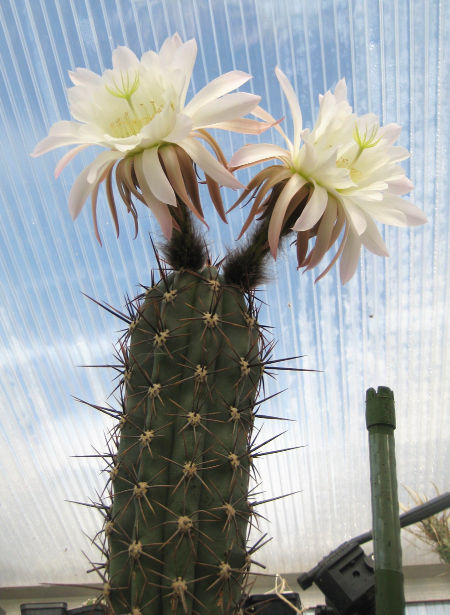im Jahr 2008 habe ich aus einer alten Sammlung aus einem Mittelbeet einen Tricho gerodet. War eine Sauarbeit und mit Schmerzen verbunden, aber was tut man nicht alles. Nun, bei mir im Gewächshaus kam der Trichocereus in einen größeren Topf, die Pflanze ist ca. 1,70m hoch, macht also entsprechend Arbeit.