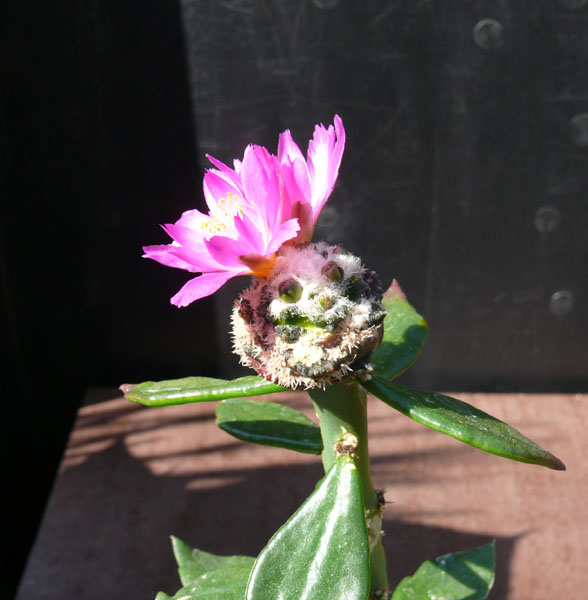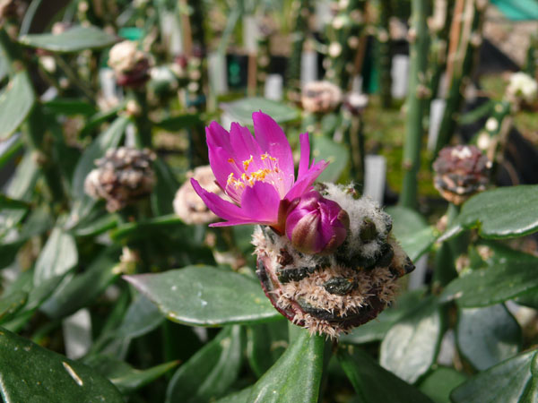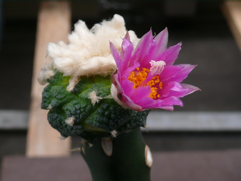 Ich habe weder einen guten Draht zu unseren Nachbarn, noch benutze ich Zaubermittel, um die Blütenknospen zu locken. Ein guter Draht ist leider vor zwei Jahren plötzlich getrennt worden, der zu meinem Lehrmeister. Ich wundere mich ja selbst darüber. Einer der ersten Ariocarpus-Sämlinge, den ich 2 oder 2,5 Jahre nach der Aussaat und dem Pfropfen mit Blüten dastehen hatte war ein Ariocarpus bravoanus, siehe mein Avatar-Bild. Andere Ariocarpen blühen früher, da braucht man keinen langen Bart und auch keine eisgrauen Haare, die tun es schon nach 5 Jahren. Zum Beispiel Ario kotschoubeyanus und agavoides. Aber das Pfropfen scheint es doch bei manchen Sämlingen zu beschleunigen.