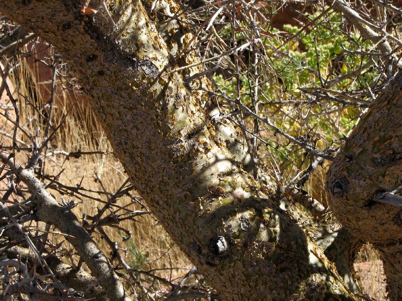 190 Commiphora glandulosa (Burseraceae) Wie bei so vielen Arten dieser Gattung, schält sich auch hier die Rinde nach und nach vom Stamm ab.