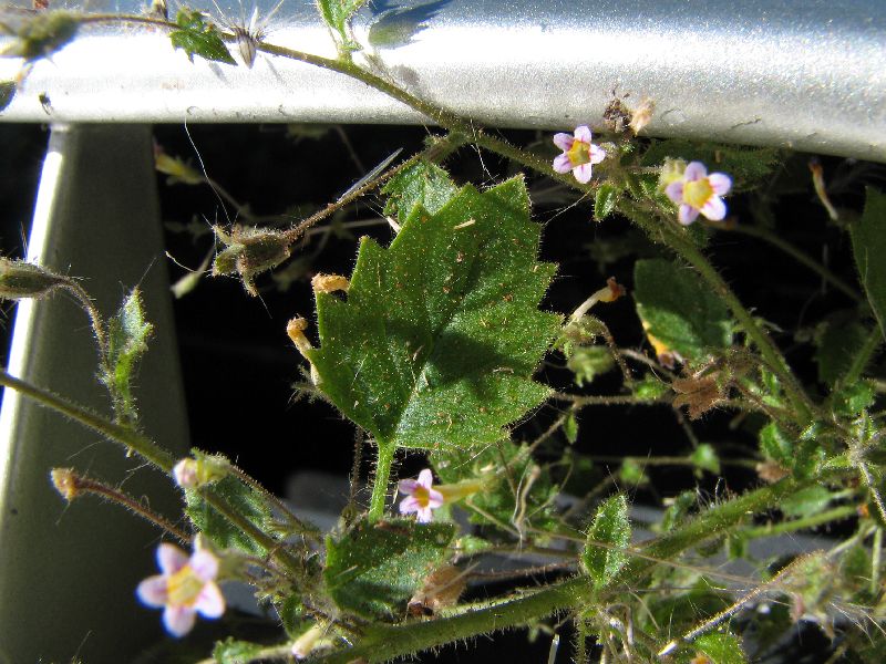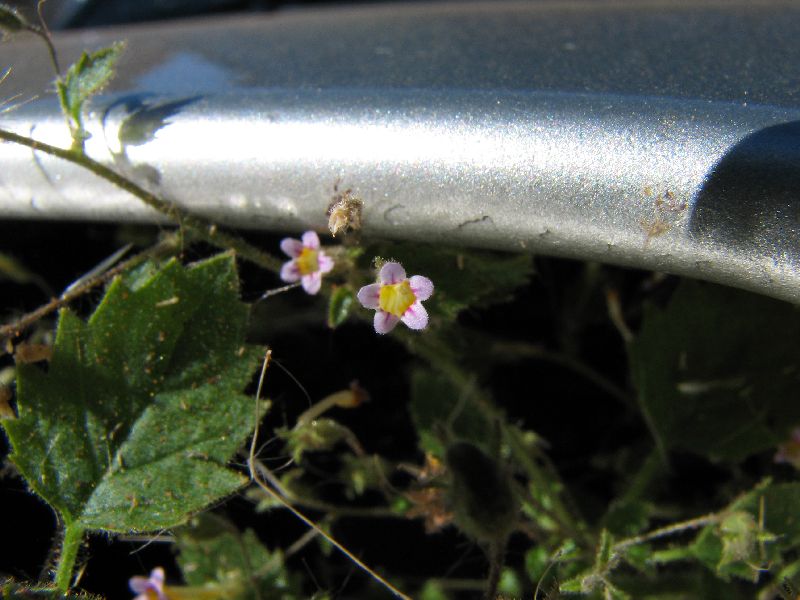 204 Myxopappus sp. (acutilobus?) (Asteraceae) 205 Myxopappus sp. (acutilobus?) (Asteraceae) 206 Cleome oxyphylla (Capparaceae) 207 Solanum burchellii (Solanaceae) 208 Solanum burchellii (Solanaceae) Da auch hier, wie an fast allen Tagen und Orten, wieder ein böiger Wind pfiff, musste ich bei einer Pflanze einen Trieb abschneiden und ihn im Kühlergrill unseres Autos fixieren, damit ich sie fotografieren konnte.