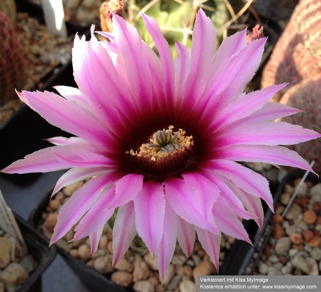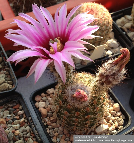 langsam geht es los mit der Echinocereen-Blüte. Heute stelle ich nochmals den Echinocereus knippelianus vor, den ich bereits am 26. Januar zeigte. Heute haben sich die ersten Blüten geöffnet. Diese Gruppe ist eine Pflanze, die auf Grund der sehr langen Rübenwurzel in einem "Clematis-Topf" kultiviert wird.