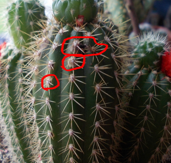 das mit dem ALLE Fragen beantworten ist schwierig - Du stellst nämlich mehr Fragen, als Du selber merkst ;-) Bei den braunen Flecken habe ich z.B. den Eindruck, dass das verschiedene braune Flecken sind, d.h. zum einen die Flecken, die an den Einstechstellen der Strohblumen entstanden sind, und zum anderen die Flecken oberhalb der Areolen (das ist die "offizielle" Bezeichnung für die Stachelbüschel), die ich für das Ergebnis von Wachstumsstörungen halte. Ich hatte jedenfalls schon mal ähnliches an einigen meiner Kakteen: Einzelne braune, verkorkte Stellen an den Areolen und im Scheitel (in dem Fall, weil ich sie zu lange nicht umgetopft hatte - können aber auch andere Gründe sein) und dann irgend wann wieder neues Wachstum, genau wie bei Deinen Säulenkakteen.