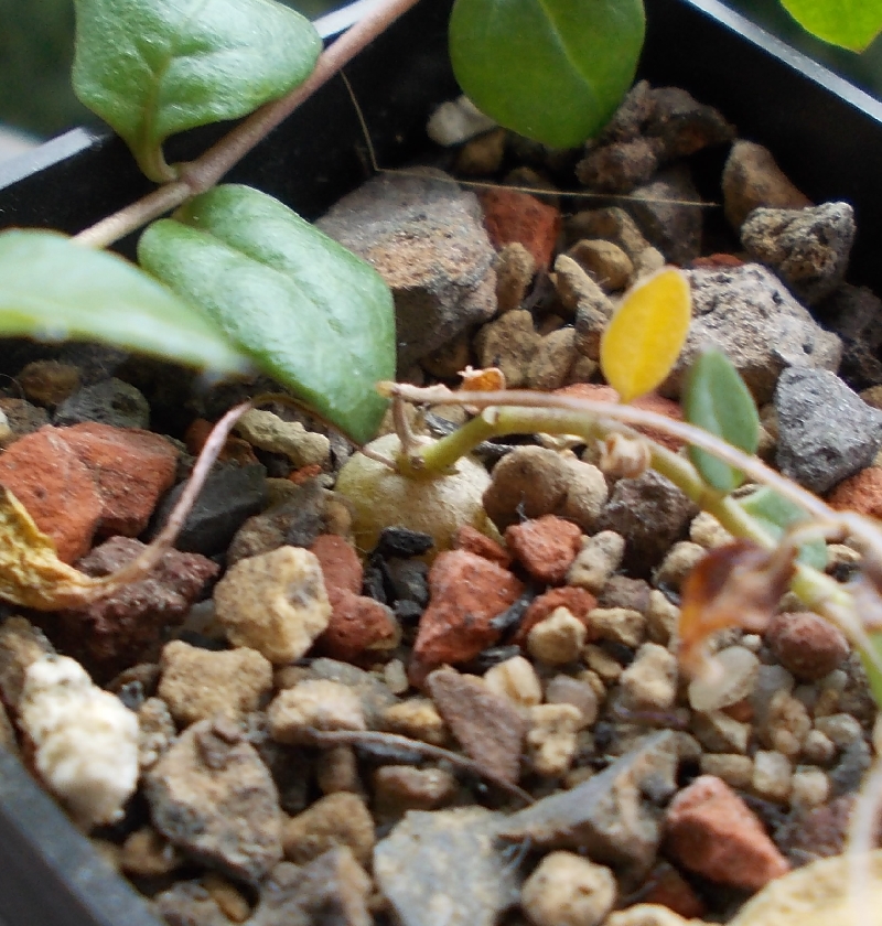 Die Knolle von Brachystelma coddii ist jetzt 7 mm im Durchmesser und zeigt andeutungsweise die typische Einsenkung in der Mitte.
