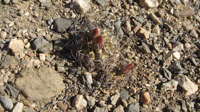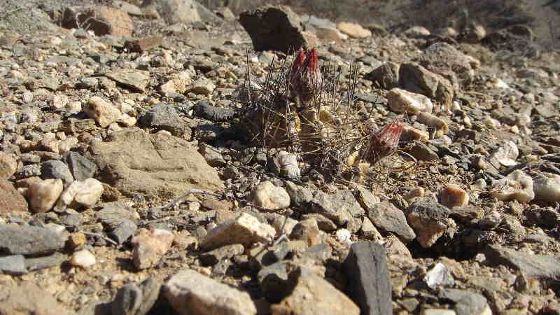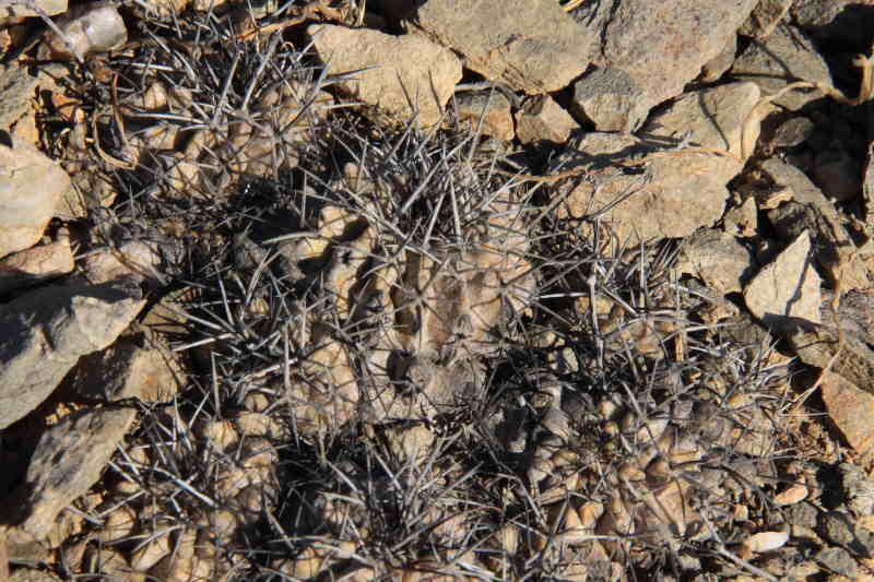 Wie man, glaube ich, ganz gut erkennen kann, sind diese Pflanzen viel derber als Eriosyce napina und haben ein ausgesprägtes Kinn unterhalb der Areole. Es gab sowohl Exemplare mit dunklerer als auch mit fahlgrüner Epidermis - vermutlich abhängig vom Stress durch Sonne und Trockenheit an ihrem jeweiligen Platz. Voll aufgeblühte Pflanzen haben wir leider nicht gefunden, was natürlich eine Bestimmung sicher erleichtert hätte.