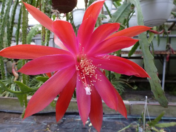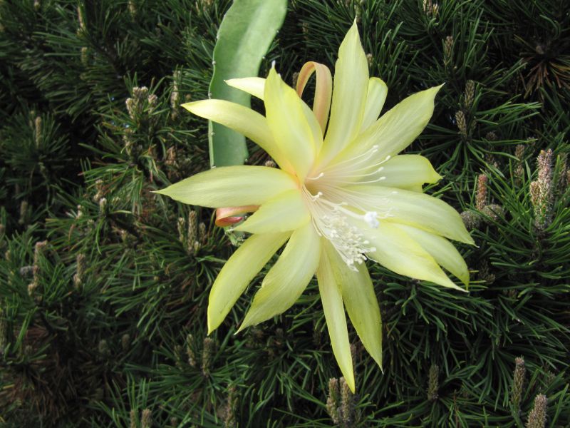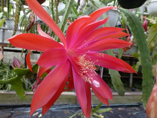 Hier zeige ich mal Bilder von meiner bisher größten Blüte, die ich an einem Aporophyllum hatte. Die Sorte heißt Evita und die Blüten erinnern schon sehr an eine Epi-Blüte, vor allem den Petersen-Frühlingssorten sieht sie recht ähnlich.
