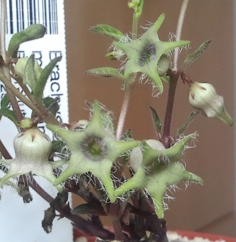 Die Blüten sind nur ca. 1cm im Durchmesser und können, laut Herrn Specks im gleichen (selbst nur wenige Quadratmeter umfassende) Gebiet eine umfangreiche Blütenvielfalt (Farbe und Musterung) zeigen. Deshalb fanden wir in seinem Gewächshaus bei derselben Art creme- bis roséfarbene, gelbliche, rote, lilane und grüne Blüten vor mit den verschiedensten Übergängen, wobei ich mich für letztere entschieden habe, wie auf den Bildern unschwer zu erkennen ist. Diese weisen noch einige lila Härchen auf, was auf dem Photo leider nicht zu erkennen ist, aber einen schönen Kontrast zu dem kräftigen Grün geben.