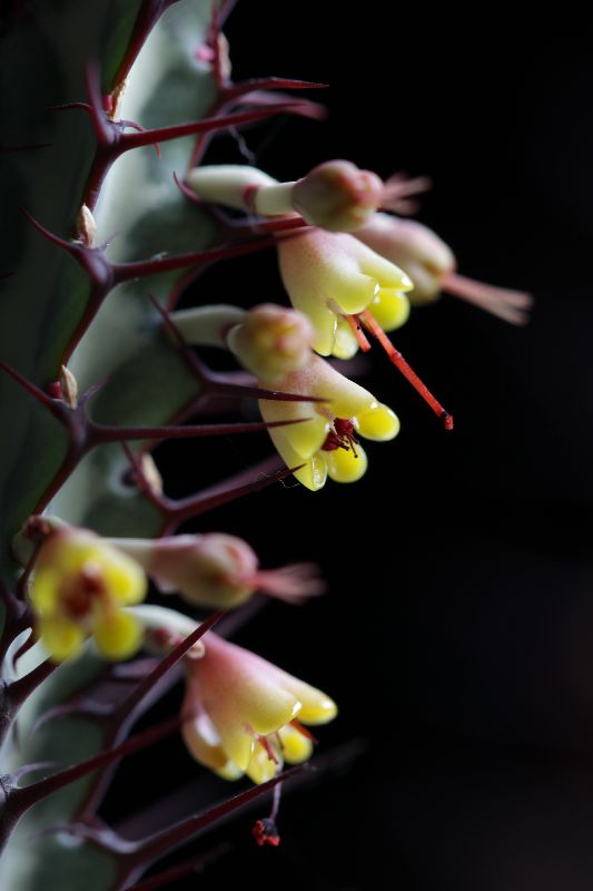Der Grund, warum ich diese Art so mag: Sie ist schon ohne Blüten sehr dekorativ mit ihren blaugrün gemuszterten und rotbraun bedornten Trieben, und die zahlreichen, leuchtend gelben Blüten (ich weiß: Blütenstände / Cyathien) mit roten Staubfäden sind wirklich eine besondere Zierde. Auch wenn sie gattungstypisch nur etwa 3-4 mm Durchmesser haben ...