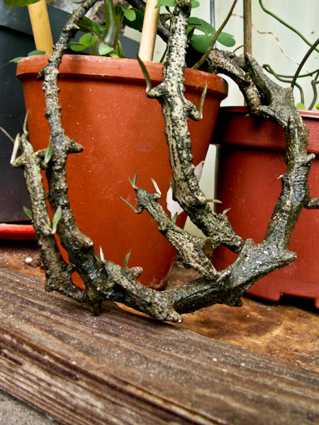 Aber wenn Du ihn nicht abschneidest, fürchte ich, wird die Pflanze anfangen, sich von der Basis her aufzuzehren. Sie hat ja schon angefangen, indem sie die Wurzeln verloren hat.