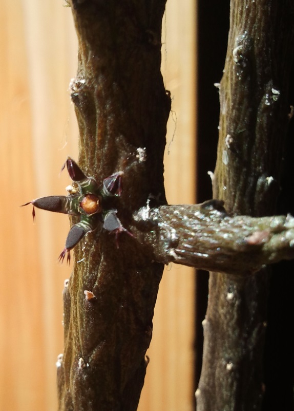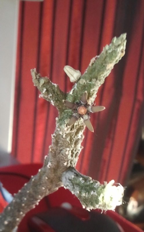 Ein zweijähriger Sämling von Larryleachia picta setzt das 1. Mal Knospen an