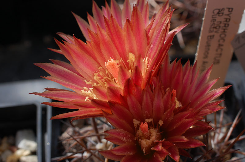 Aktuell blühen auch ein paar von den Pyrrhocactus (Ritt. ) aus dem extremen Norden Chiles in dem eine Vollwüste vorherscht, die nur durch die Nebelbänke des Pazifik Feuchtigkeit erhält. Der Nebel treibt gegen die Küstenberge die vom Strand direkt in steilen Geröllhalden ansteigen und gibt seine Feuchtigkeit am intensivsten auf einigen Hundert Höhenmezern ab. Die Quebradas (ausgetrocknete Flusstäler) kanalisieren die Nebelmssen manchmal ein Stück weiter ins Inland hinein.