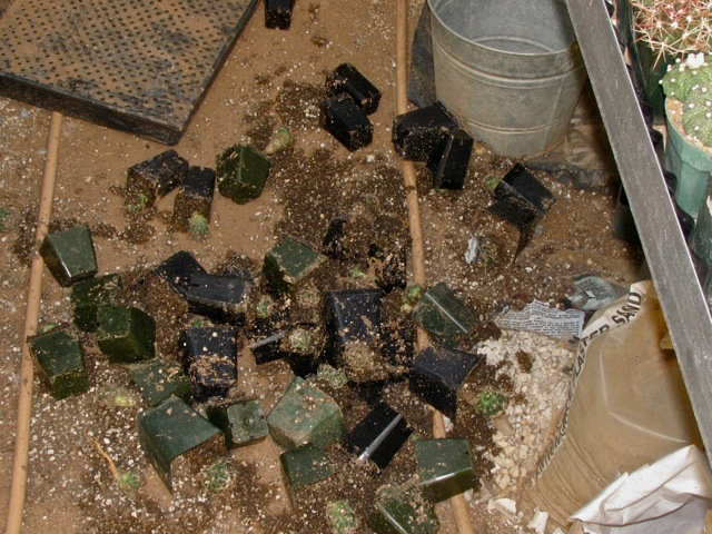 Das Resultat einer Kollision der Knöchel meiner rechten Hand mit Sämlingen des Ferocactus viridescens ssp littoralis (ganz oben rechts im Bild) nach dem Eintopfen 3 jähriger Coryphantha cornifera, Peña Miller, QRO unter brütender Sonne: