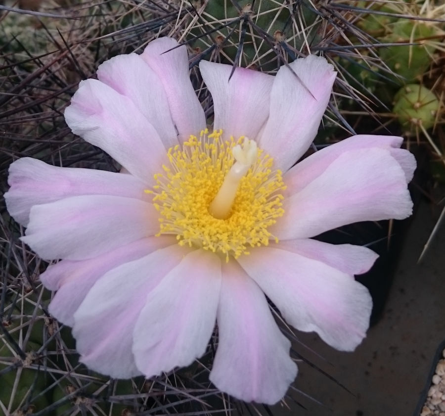 nun ist auch Tephrocactus geometricus f. Fiambala zur Blüte gekommen in diesem Jahr mit nur einer Blüte. Der andere Pflanzenkörper hat es vorgezogen 2 neue Glieder zu bilden.