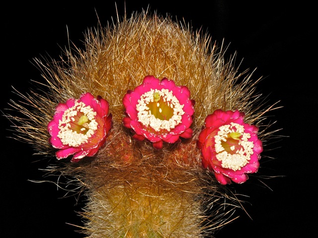Das ist Espostoa/Trixantocereus senilis, die nicht im Vorgarten, aber im großen Garten hinterm Haus frei ausgepflanzt und nahe Herberts Bezugspunkt, der Welwitschia mirabilis, steht.