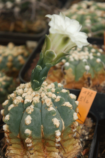 Die Bilder zeigen die erste Blüte eines 2003 ausgesätes Gymnocalycium riojense subsp. riojnse var. pipanacoense BKS 125.