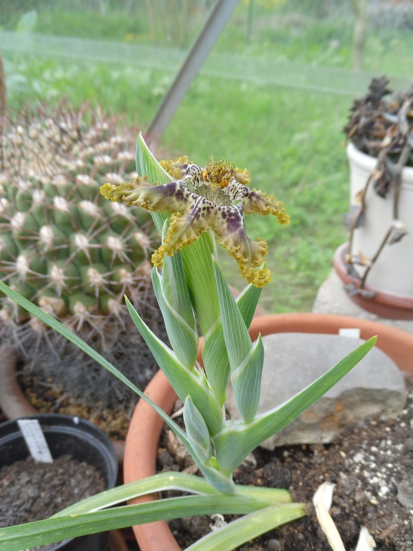 Nachdem ich jetzt drei Jahre lang immer nur ein paar Blätter im Winter hatte, habe ich die Hoffnung langsam aufgegeben, und den Topf mit den Knollen im jetzt abgelaufenen Winter im ungeheizten Gewächshaus gelassen. Und gerade als ich Anfang April dachte, jetzt stelle ich Dich mal raus, das wird wohl nichts mehr, da sehe ich, dass sie einen Blütenstand zu bilden scheint: