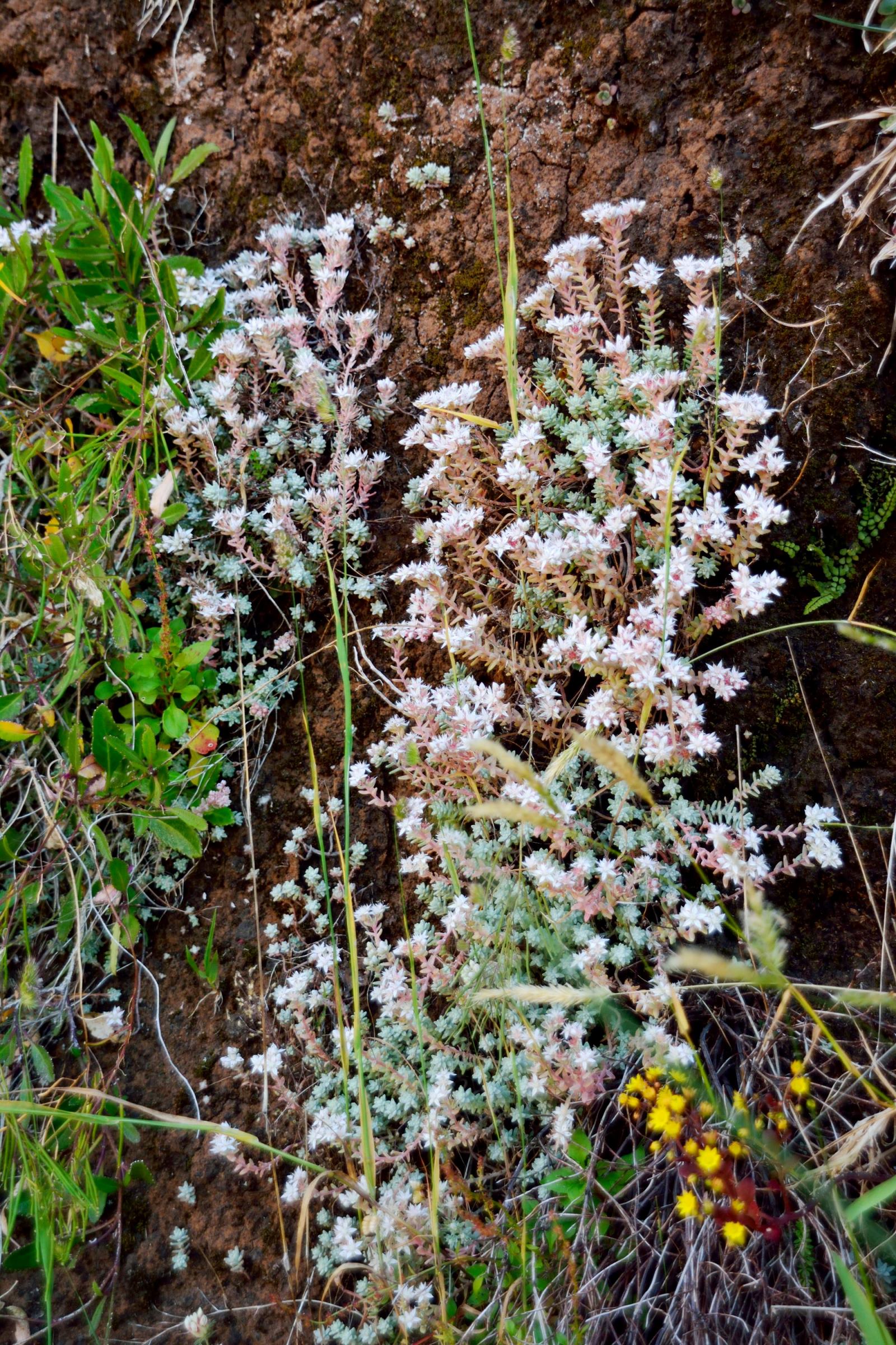 Aeonium glutinosum, das Kleb-Aeonium, macht seinem Namen alle Ehre. Es ist ein Kleinstrauch mit sehr sparrigem Blütenstand, recht weit verbreitet auf der Insel, meist an südlichen Hängen und Steilwänden. Aeonium glandulosum ist eher an nördlich ausgerichteten Steilwänden zu finden. Es ist mehr oder weniger tellerförmig und erinnert etwas an A. tabuliforme (Teneriffa) oder A. canariense var. subplanum (La Gomera). Die Art ist in den Bergen bis 1700 m verbreitet und kann dort an für Mensch und Ziege unerreichbaren Felswänden Massenbestände bilden. Beiden Aeonien blühen gelb ab Juni. Sedum nudum ist relativ häufig an sonnigen Felswänden zu finden. Das sehr ähnliche Sedum brissemorettii ist deutlich seltener und wächst an schattigeren Orten. Beide blühen gelb. Sedum farinosum ist eine sehr schöne, weiß bereifte und weiß blühende Art, die nur in den Hochlagen wächst. Blütezeit aller genannten Arten ist ebenfalls ab Juni / Juli. Eine weitere Art, Sedum fusiforme, ist sehr selten und ich habe es in der Natur nicht gefunden. Die ein- bis zweijährigen Aichryson-Arten wachsen an schattigen, eher feuchten Orten, durchaus auch in größeren Höhen. Die Sukkulenz ist nicht nur schwach ausgeprägt. Das behaarte Aichryson villosum kommt auch auf den Azoren vor, wohingegen das kahle Aichryson divaricatum und Aichryson dumosum endemisch sind. Letztere ist so geschützt, dass es keinerlei Auskunft zum Wuchsort gibt. Aichryson villosum wird nur wenige Zentimeter groß und ist wie das deutlich größere und vielblütige Aichryson divaricatum an eher schattigen, feuchten Stellen, oftmals an senkrechten Wänden im Lorbeerwaldbereich zu finden. Man findet sie aber auch in den Hochlagen an Felsen meist an schattigen Orten. Die gelben Blüten erscheinen im Sommer. Interessanterweise findet man auf der trockenen Halbinsel São Lourenço kaum sukkulente Pflanzen (an einigen Stellen Mesembryanthemum sp.), sondern eher Gräser und trockenheitstolerante, aber nicht sukkulente Pflanzen.