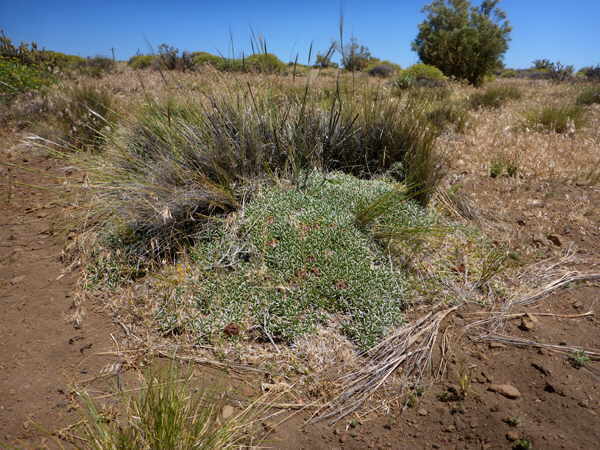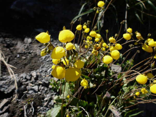 Im andinen Bereich sehen wir viele solcher herrlich blühenden Wiesen: Die Strecke erweist sich im weiteren Verlauf als ziemlich übel und wir müssen zwischendurch den Río Kilca überqueren: Aber danach erreichen wir die asphaltierte Hauptstraße und es geht ganz entspannt weiter. Noch etwas unterhalb vom Pass gibt es ein kleines feuchtes Areal, wo wir Calceolaria filicaulis in Blüte antreffen: Ganz oben lohnt es sich nach Kakteen zu suchen, denn hier wächst Maihuenia poeppigii: Aber es gibt nicht viele Exemplare und sie sind gar nicht so leicht zu finden, weil sie aus der Entfernung den Azorellas zum Verwechseln ähnlich sehen.
