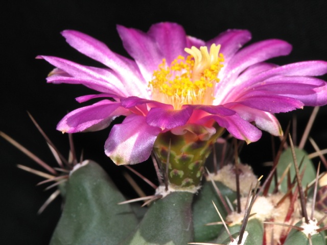 ich habe hier einen Thelocactus ohne Namen. Gestern hat er zum ersten Mal geblüht. Auf Grund der Blütenfarbe sowie des Körpers habe ich mich anhand der Beschreibung hier: http://www.thelocactus.cactus-mall.com/ ... i_des.html zu eben diesem entschieden.