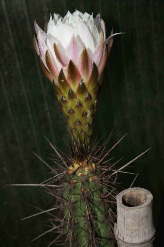 Eigentlich hat mich der Name nicht so interessiert. Aber jetzt blüht der auch noch! Die Säule ist ca. 1 Meter hoch bei 4cm Durchmesser. Bis jetzt unverzweigt, aber gerade bildet sich an der Basis ein neuer Trieb. Vielleicht ist das ja ein Zeichen der Blühreife. Die Blüte ist 11 cm lang. Als Knospe sehr schön rosa, wie man ja noch an den äußeren Petalen sieht. Besonders pflegeleicht ist der Kamerad nicht gerade. In einem kalten, feuchten Winter sind mal die Wurzeln weggefault (mein Gewächshaus ist nicht ganz sicher frostfrei). Nachdem er 4 Wochen zum Trocknen auf der Seite lag, war er krumm wie eine Gurke (neue EU-Norm). Ich habe ihn dann an einem Bambusstock geradegebunden und zum Bewurzeln aufgehängt. Der Stock ist dran geblieben, damit ich ihn überhaupt handhaben kann. Er wächst nicht gerade sehr schnell.