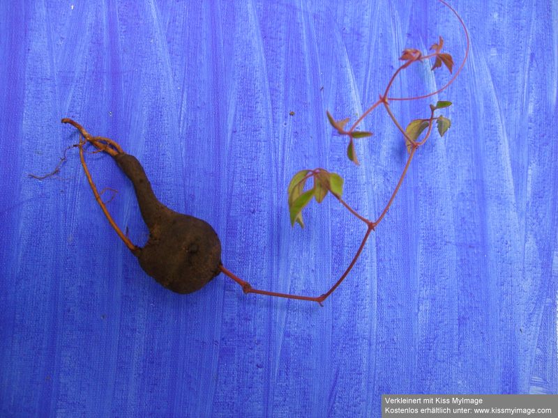 Der Caudex (zumindest der sichtbare, oberirdische Teil) ist bei mir nur etwa so groß wie eine Walnuss, aber die Ranken werden bis 2 m lang.
