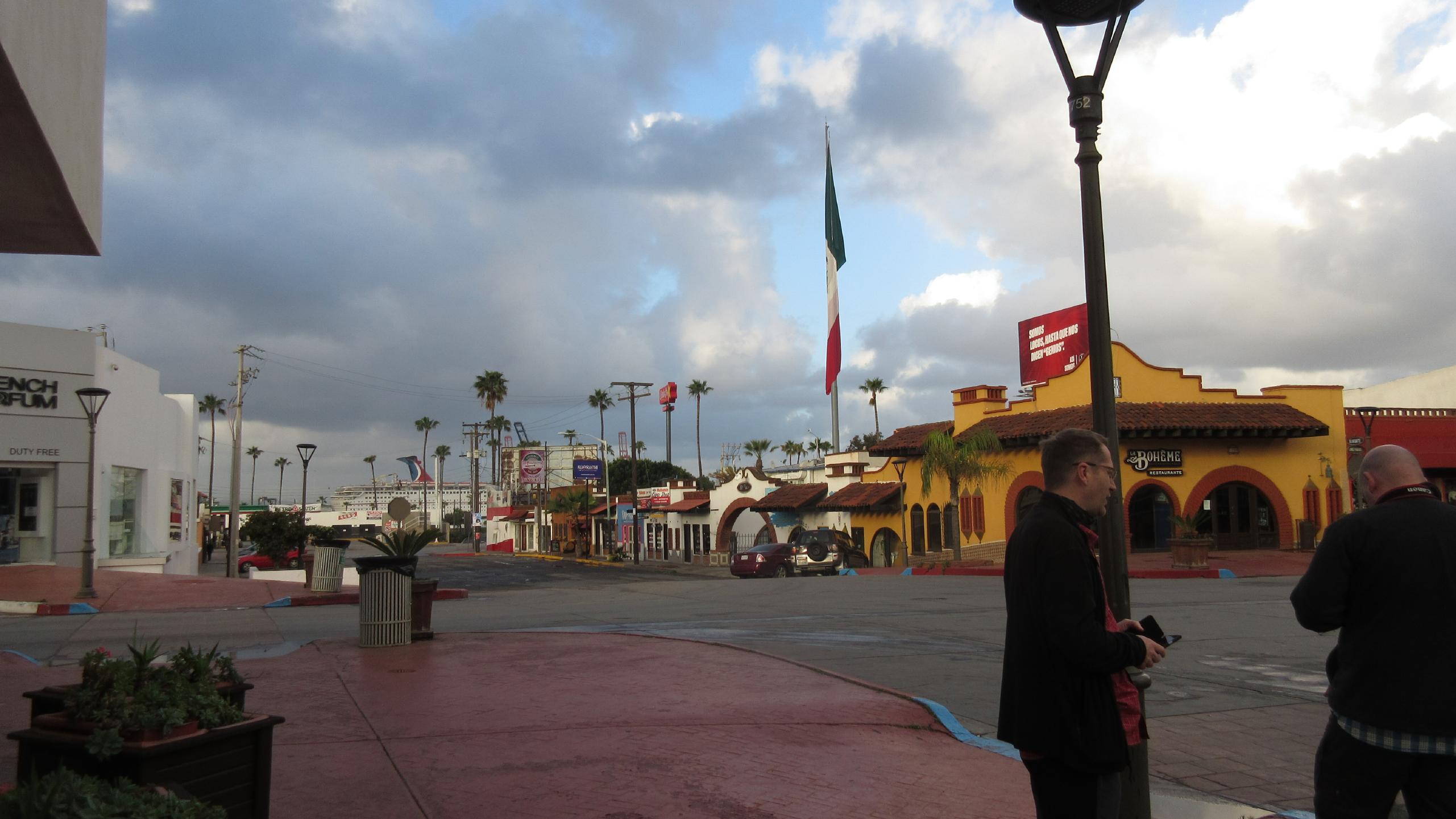 In Ensenada: das Restaurant auf der anderen Straßenseite ... und da kein Wind weht, ist die Mexiko-Flagge leider nicht für Vorträge zu gebrauchen.