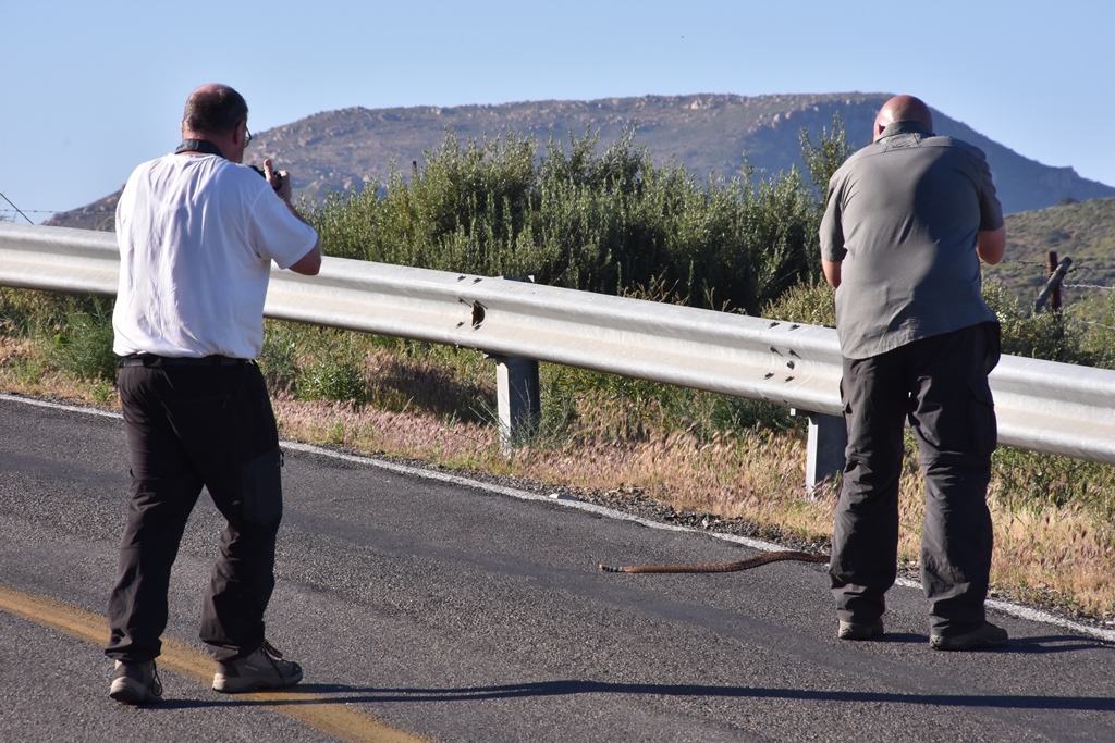Vollbremsung, Bremse anziehen, Fotoapparat greifen und aus dem Auto heraus vollziehen sich in Sekundenbruchteilen. Die Schlange hat es glücklicherweise nicht so eilig. Höchstwahrscheinlich