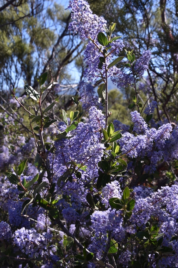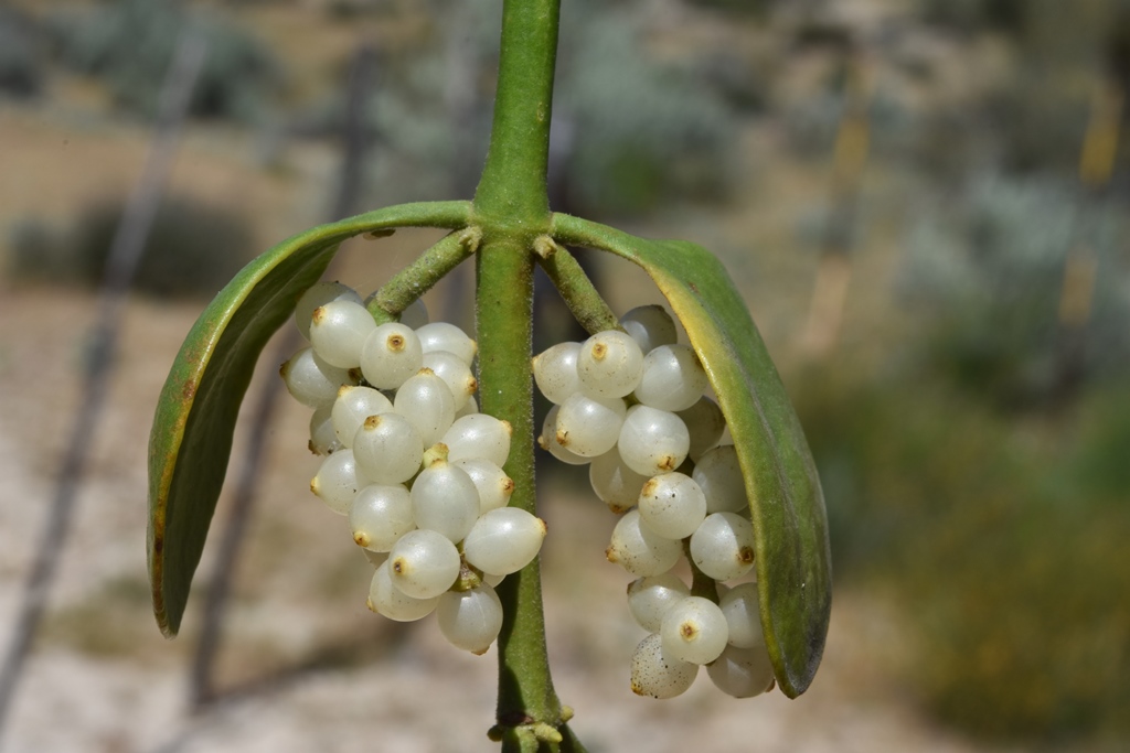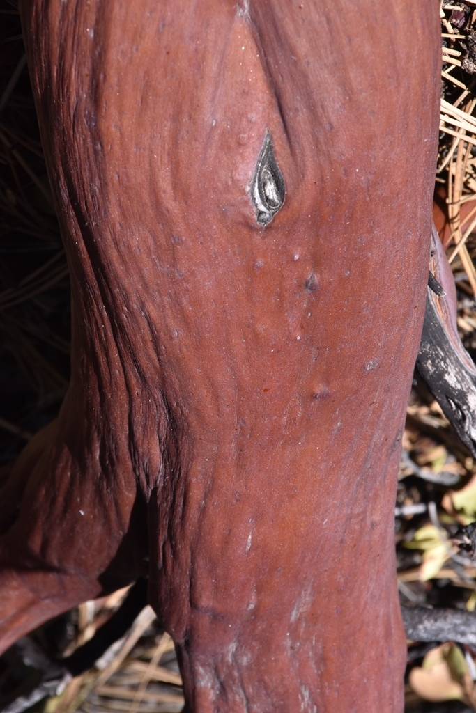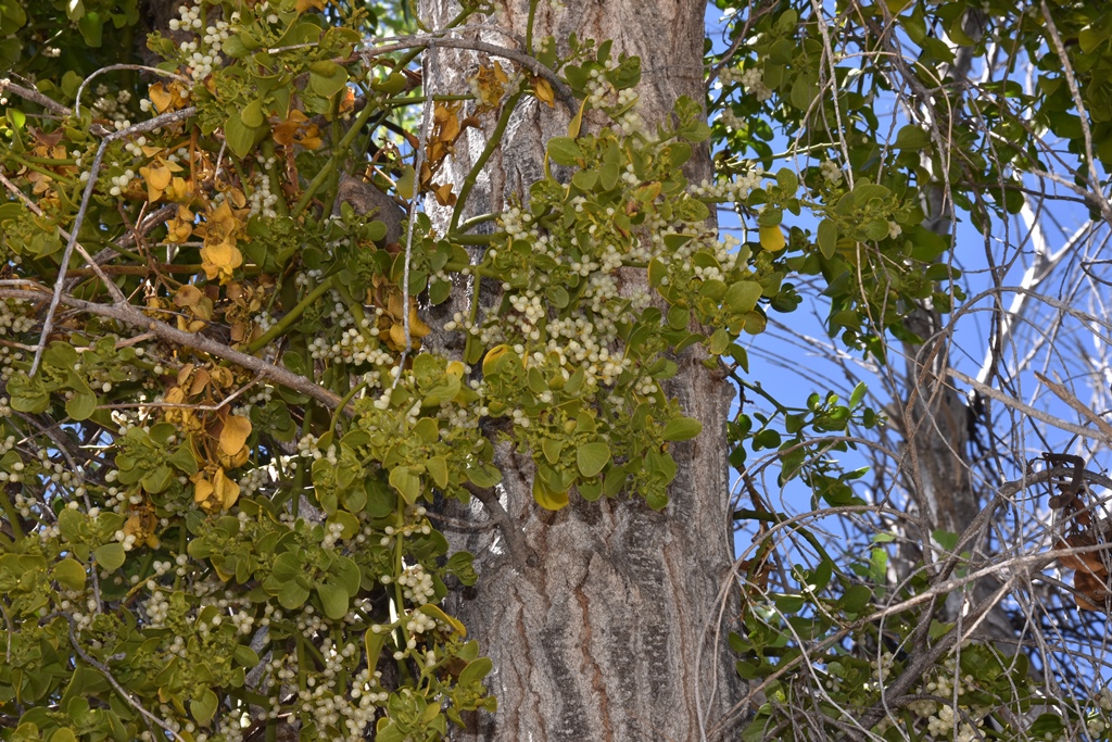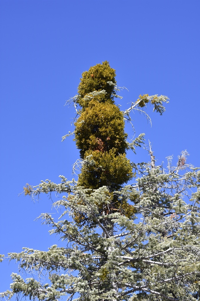 nun bleibt mir noch ein paar Kleinigkeiten nachzureichen, so beispielsweise das Panorama mit dem Picacho del Diablo. Mit 3095 m die höchste Erhebung der Baja California. Der violett blühende Strauch ist ein Ceanothus sp. wahrscheinlich C. oliganthus var. orcutii (aufgrund der gezähnten Blattränder, die bei C. leucodermis – einer weiteren violett blühenden Art der Region – glatt sind). Der Parasit auf Abies concolor (Colorado-Tanne oder auch Grau-Tanne) ist Phoradendron bolleanum. Die Gattung gehört in die Familie Viscaceae, ist also tatsächlich eng mit der bei uns heimischen Mistel, Viscum album, verwandt. Ebenfalls oben in den Bergen gab es auch Erica-Verwandte, nämlich Arctostaphylos sp. Die Rinde ist rotbraun und sehr glatt. Wieder weit unten, aber auf Populus sp. konnten wir begeistert Phoradendron serotinum subsp. macrophyllum beobachten. Aber nur ich tat das. Dabei wurde ich, wie oben zu sehen, offensichtlich von Big Brother beobachtet und dokumentiert. Die beiden Herren langweilten sich offensichtlich und scharrten schon mit den Fero-Hufen, um ein paar hundert Meter weiter auf die schon bekannten Ferocactus viridescens subsp. "was-weiß-denn-ich" zu stoßen. Egal, die Fotos hier wären ohne etwa 2 Minuten Ausflug auf die Bäume nicht möglich gewesen.