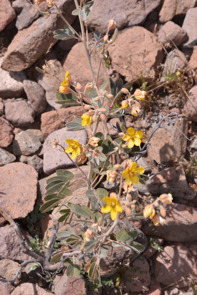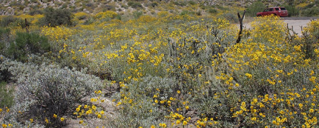 Phoradendron californicum, eine Art, die auf verschiedenen holzigen Fabaceae (Leguminosen) parasitiert. Die größeren Ferocactus acanthodes subsp. rostii sind wie schon beschrieben meist strohgelb bedornt, aber es gibt auch einige mit rosa Hauch. Die „Farbvarianten“ stehen durchaus dicht beisammen. Salvia columbariae Manfred auf der Suche nach Ferokakteen. Man kann sich ja mal irren