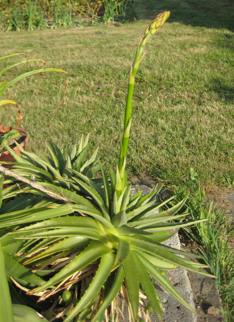 ich habe hier seit letztem Jahr eine sehr schöne Dyckia-Altpflanze. Ich hab sie kalt (um die 0-5°C) überwintert und seit dem späten Frühjahr steht sie im Freien. Es scheint ihr zu bekommen, denn seit kurzem treibt sie einen Blütenstand. Falls sich da jemand auskennt, welche Art könnte das sein?