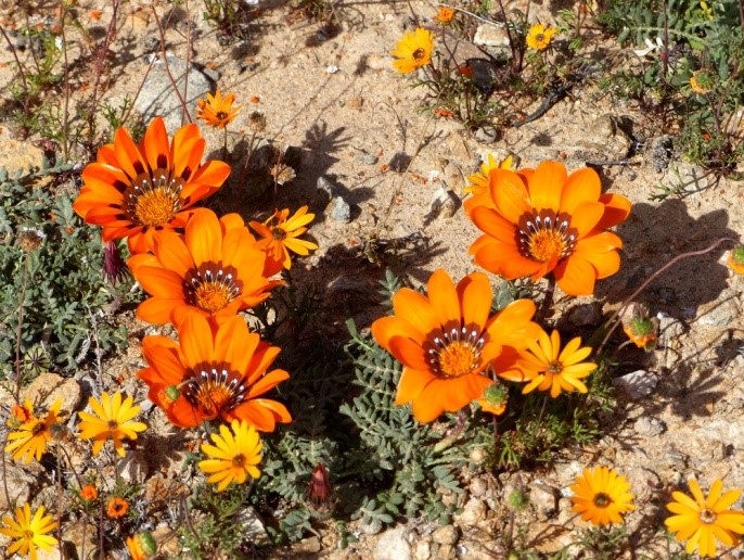 es stimmt, dass Teile von Südafrika sehr trocken und sukkulentenlastig sind, aber es gibt Gebiete mit Winterregen, also die Regionen, die in diesem Bericht bereist wurden, und Sommerregen-Regionen weiter östlich und nördlich. Das heißt, einmal im Jahr kommen dann doch regelmäßig Niederschläge herunter. In 2019 hat es in der südlichen Namib-Wüste und im Namaqualand schon früher und mehr als gewöhnlich geregnet (das nennt sich auch Klimawandel), aber der positive Effekt auf die Flora war auch schneller als sonst vorbei. Eigentlich könnte man noch mehr Blüte in der Monatswende von August auf September erwarten. Die blühende Wüste ist zeitlich auf wenige Wochen limitiert. Danach ist es dann mindestens 9-10 Monate knochentrocken und braun. Außerdem gibt es einen Gradienten von Nord nach Süd, in dem die Feuchtigkeit stetig zunimmt. Daher liegen die Kapflora und die Flora der Karoo praktisch Tür an Tür und gehen an manchen Stellen fast unmerklich ineinander über. Südafrika ist in vielerlei Hinsicht extrem kompliziert, in den Ökosystemen gleichermaßen wie beim Klima oder der Geologie. Das aber ist genau das Geheimnis, warum das Land immerhin mindestens 20.000 Pflanzenarten beherbergt. Buchstäblich alle 50 Kilometer ändert sich die Landschaft und die Ökologie. Und wer Verbreitungskarten verschiedener Arten studiert, ist erstaunt, auf welch kleinen Flächen viele Arten vorkommen.