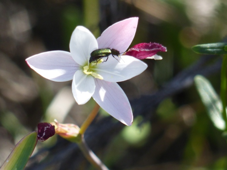 Von Springbok aus nehmen wir die direkte Straße nach Westen Richtung Kleinzee. Nach etwas mehr als einer Stunde Fahrt legen wir den ersten Fotostopp ein. Es ist immer noch sonnig und windstill, also bestes Fotowetter. Wir finden auch gleich ein paar für uns neue Pflanzen, etwa eine Ornithogalum- und eine Lapeirousia-Art. Wir halten uns über eine Stunde auf und finden immer noch Neues. Aber um 10.00 Uhr reißen wir uns los und setzen die Fahrt fort. Schon nach 20 Minuten halten wir an einem frei stehenden Granitberg erneut an und klettern den Hang hinauf.