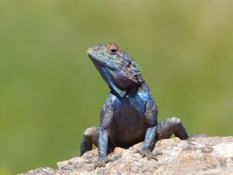 Das Wetter ist sehr warm und fast windstill, aber die Natur erscheint hier oben trotzdem recht frisch. So erleben wir auf dem Weg zu den Felsmalereien überall größere Teppiche mit Blumen in diversen Farben und Arten. Natürlich dominieren hier Geophyten, so auch Mengen von sehr imposanten Ferrarias. Auf den warmen Felsen posieren Agamen im metallic blauen Hochzeitskleid.