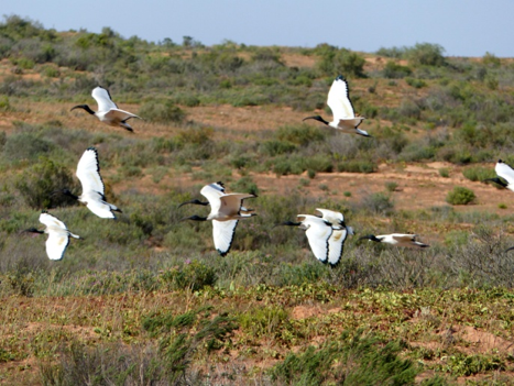 Heilige Ibisse überfliegen das Sandveld.